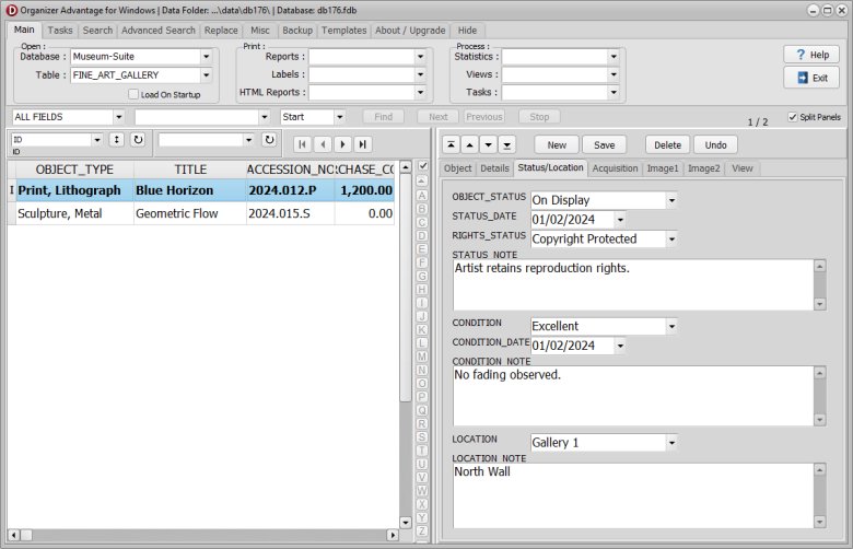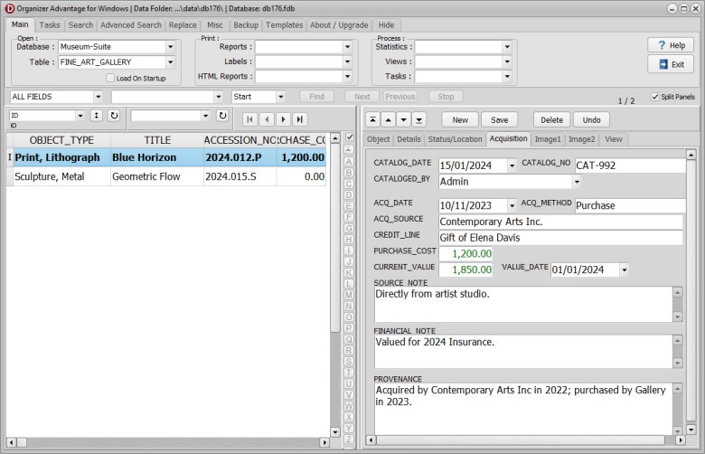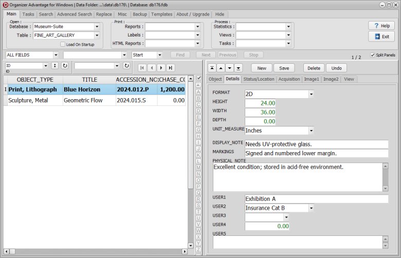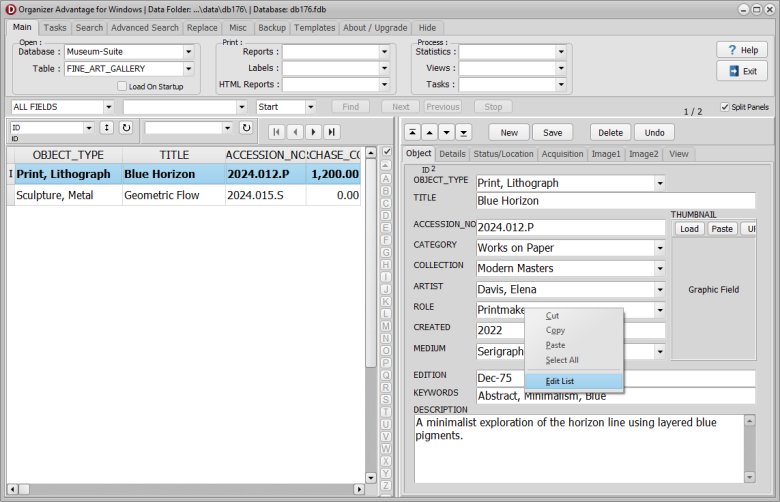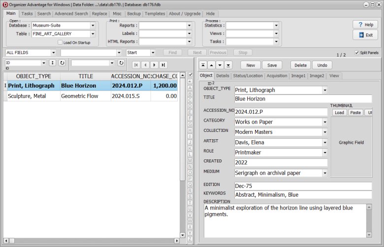 | Key Gallery Fields | Includes specialized tracking for Artist, Medium, and Edition to maintain precise cataloging standards for the art market. |