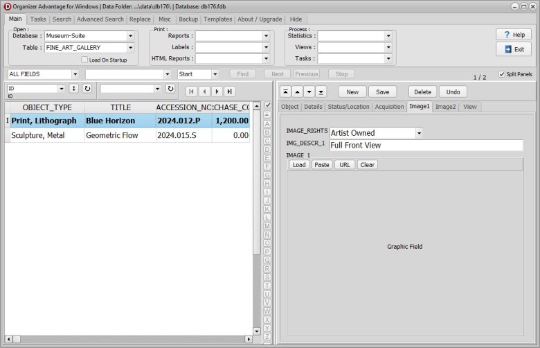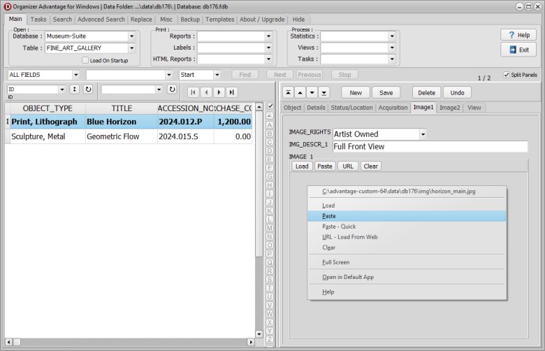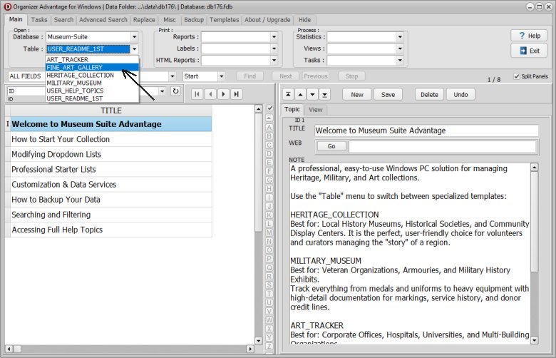 After installing the Museum Suite Advantage, click the TABLE dropdown in the software and select FINE_ART_GALLERY to load.