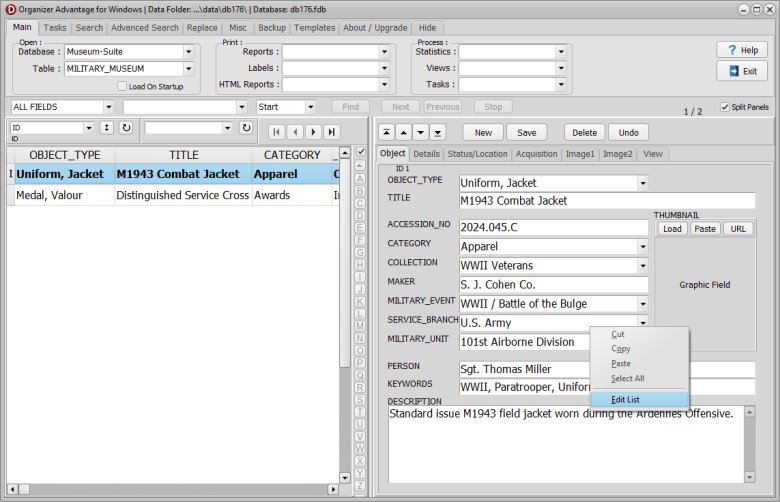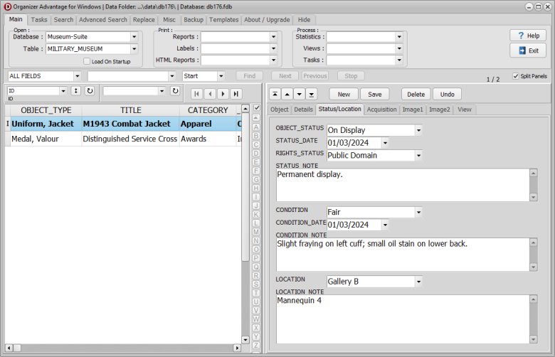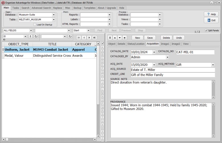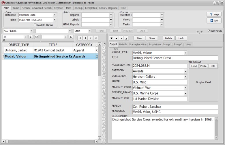 The Military Museum solution is a specialized framework and app for Windows PCs designed to document and manage the unique complexities of martial history. It provides dedicated windows for tracking the provenance of service-related artifacts, ensuring that the connection between an object, its wearer or user, and the specific historical conflict remains intact. From technical weaponry specifications to the delicate preservation of textile uniforms, this solution ensures comprehensive lifecycle management for military heritage.