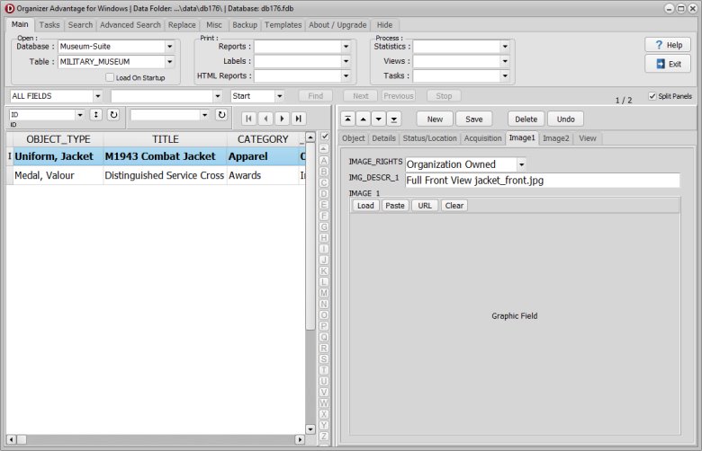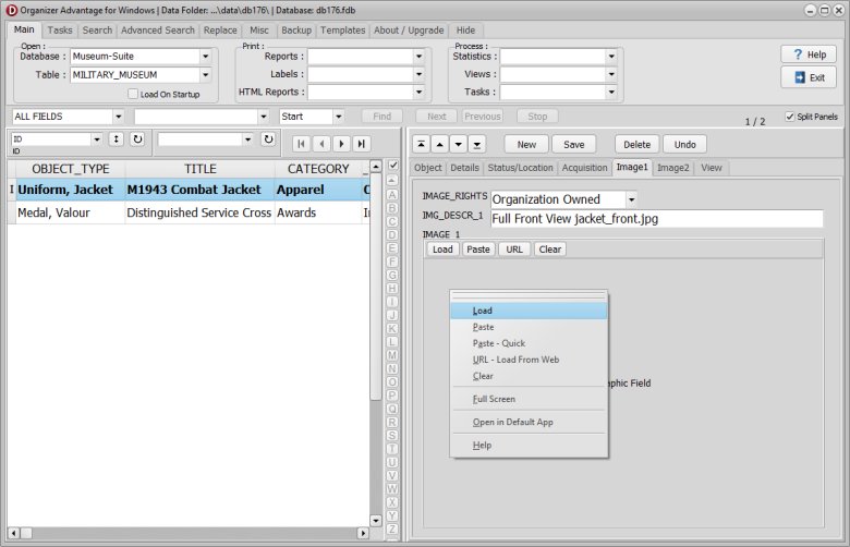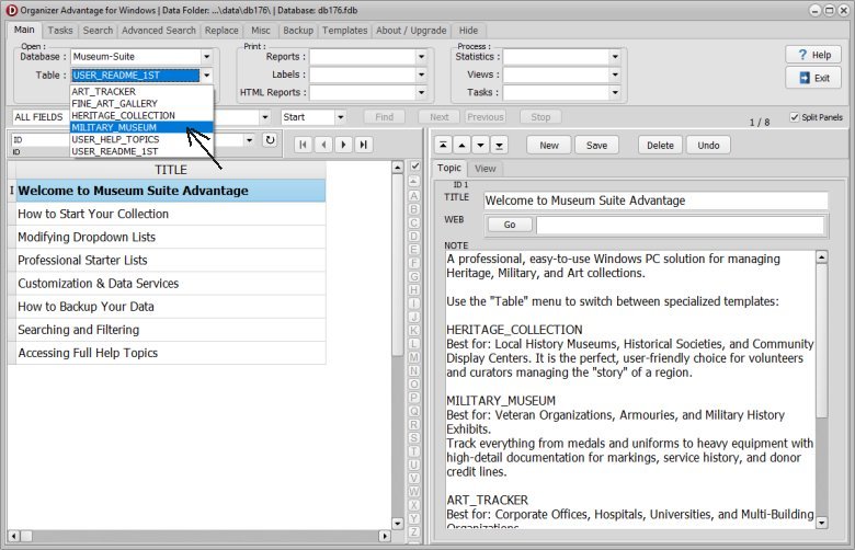 After installing the Museum Suite Advantage, click the TABLE dropdown in the software and select MILITARY_MUSEUM to load.