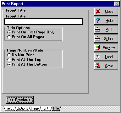 After the report has been created you may want to test it by clicking on the Preview button. If you are not satisfied with the report adjust the report options and Preview it again. When you are satisfied with the report you can print it on the Windows current printer by clicking on the Print button. If you think you may want to use this report in the future save the report as a Report Template by clicking on the Save button. Later you can reuse the saved report by clicking on the Load button.